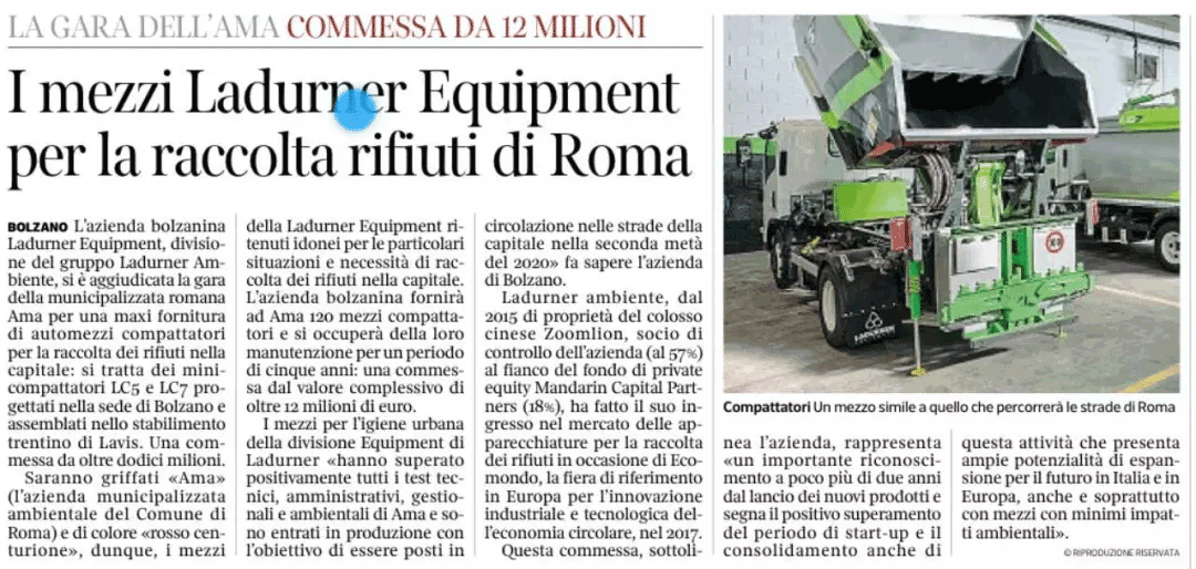 “上門回收,意味著一些狹窄或者擁堵的街區(qū),大車難以通過,只能使用中小型壓縮式垃圾車進(jìn)行收集壓縮轉(zhuǎn)運(yùn)。而公司LC7壓縮式垃圾車正好滿足要求,其小巧而自重輕,容積大,壓縮比高,運(yùn)轉(zhuǎn)效率高。”盈峰環(huán)境海外業(yè)務(wù)負(fù)責(zé)人介紹到。“意大利Ladurner中標(biāo)羅馬環(huán)衛(wèi)裝備億元大單在意大利引起強(qiáng)烈反響,當(dāng)?shù)孛襟w爭(zhēng)相報(bào)道。盈峰中聯(lián)環(huán)衛(wèi)裝備不僅遍布意大利眾多城市,還銷往了波蘭,立陶宛等其他歐洲國家。”